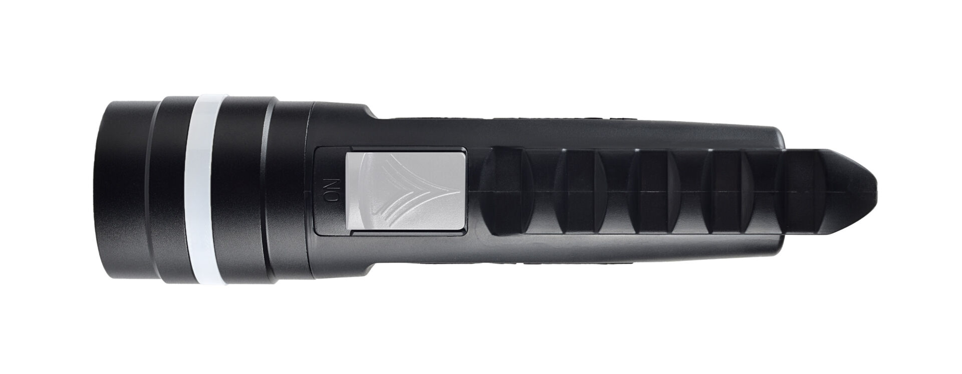 Junta tórica de color blanco sobre cabeza de aluminio para amortiguar los golpes y hacer más visible la linterna.
